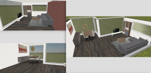 Repenser tout le RDC pour en faire un « loft » plutôt qu’un chalet: nouvelle implantation, proposition de matériaux, couleurs, mobilier, etc. – achat mobilier, luminaires, bibelots, décoration murale, etc. – confection, livraison et pose rideaux/stores – mise en place
