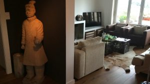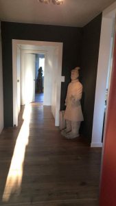 Repenser tout le RDC pour en faire un « loft » plutôt qu’un chalet: nouvelle implantation, proposition de matériaux, couleurs, mobilier, etc. – achat mobilier, luminaires, bibelots, décoration murale, etc. – confection, livraison et pose rideaux/stores – mise en place