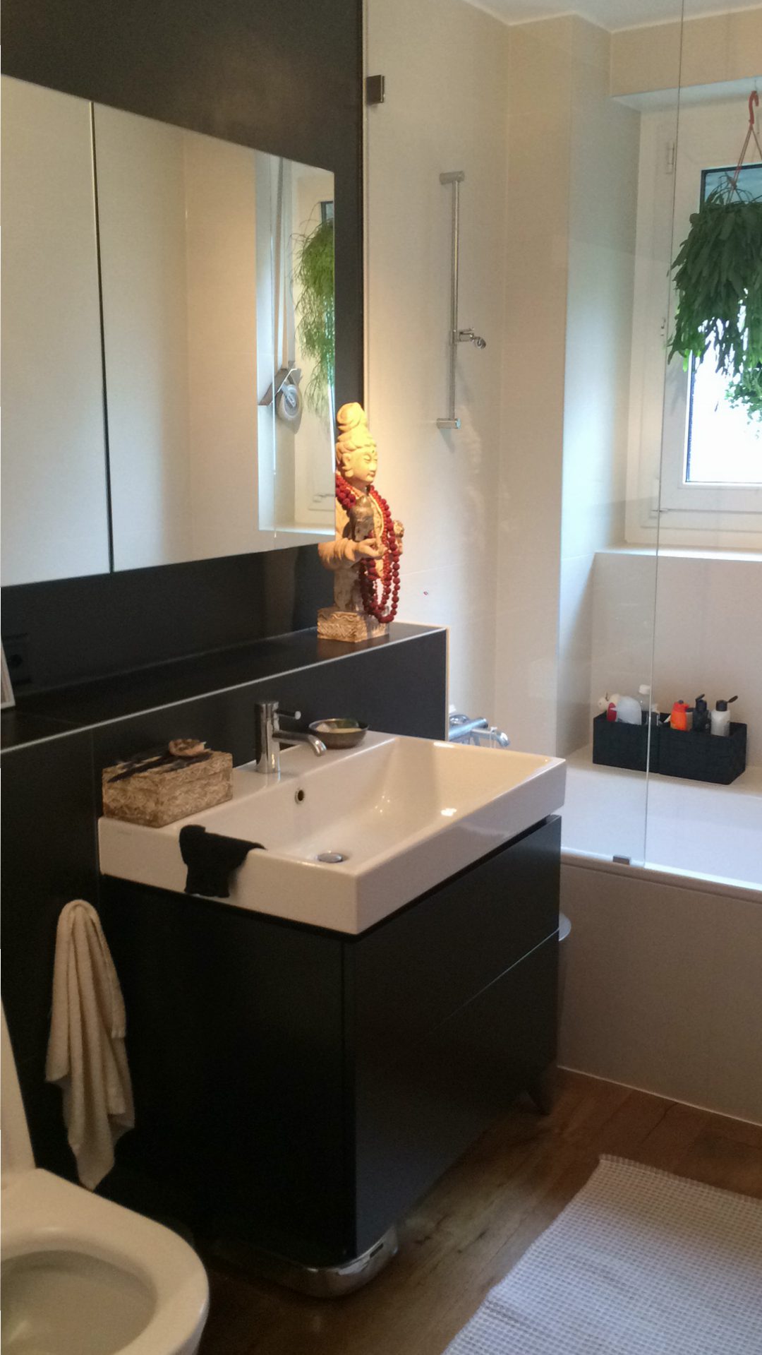 Création d’une salle de douche entre 2 chambres d’enfant/amis – rénovation complète d’une salle de bain – suivi de chantier (nouveau parquet, peinture, etc.) – création d’un bureau sur mesure, etc.